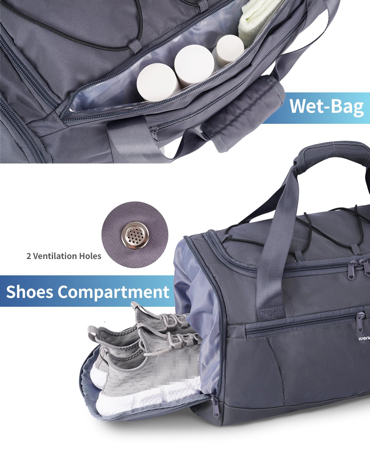 - 【Wet and Shoe Compartments】Stay organized with a waterproof pocket for damp clothes or swimsuits, and a ventilated compartment to keep your shoes fresh and separate. Gym bag with shoe compartment and wet pocket ensures clean and odor-free storage on the go.