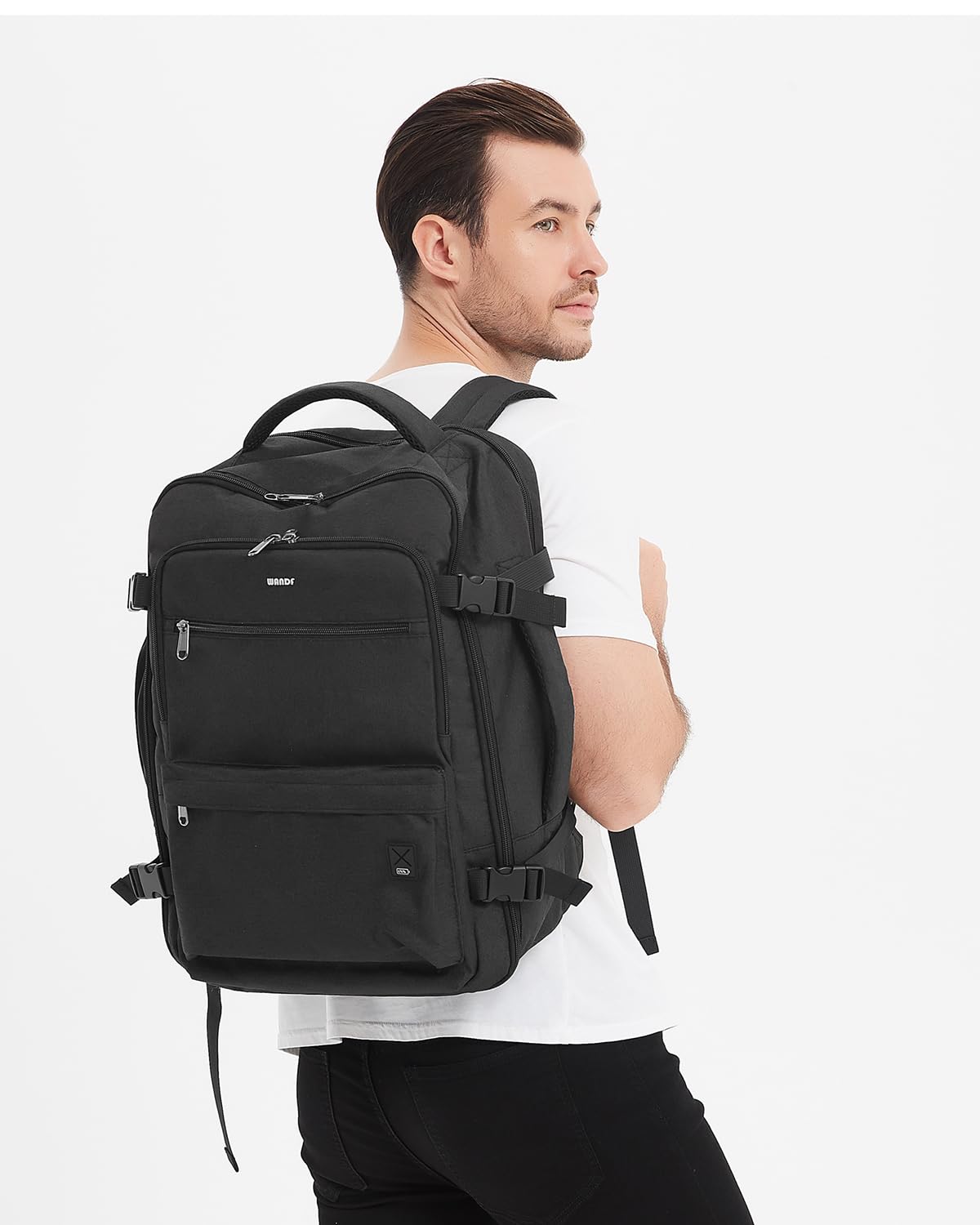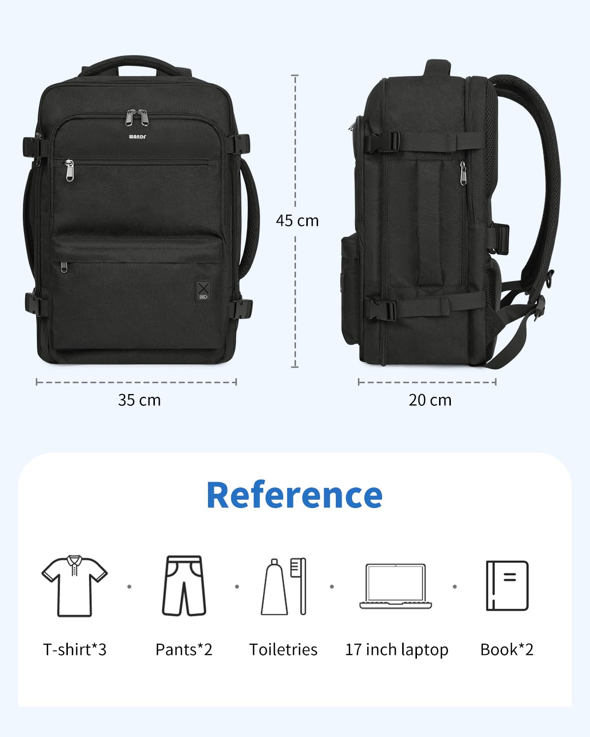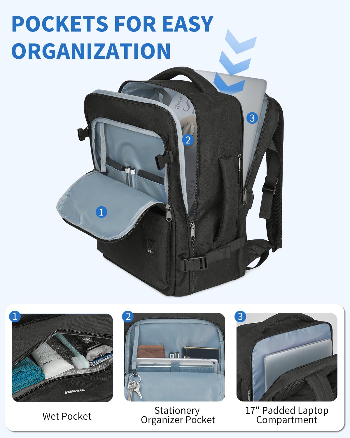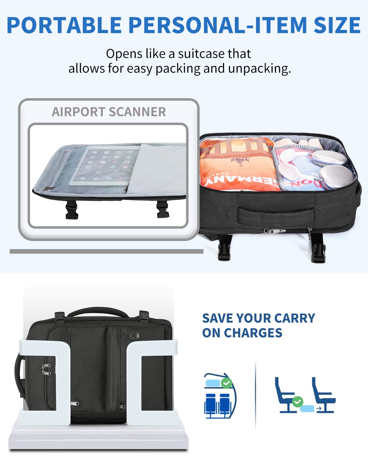 Airline Approved Carry On Backpack (18x13.5x8") meets Spirit & Frontier Airlines' personal item requirements, fitting perfectly under seats to avoid fees. This versatile backpack opens 180° for easy security checks and features a waterproof wet pocket, 17" laptop compartment, and multiple organized pockets including anti-theft storage. Designed for comfort with padded straps, ventilated back panel, and dual carry handles.